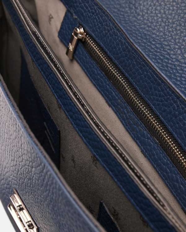 Interior details: 3 compartments, central pocket with velcro closure, side pockets with phone holder and card holder/ business card and zip pocket.