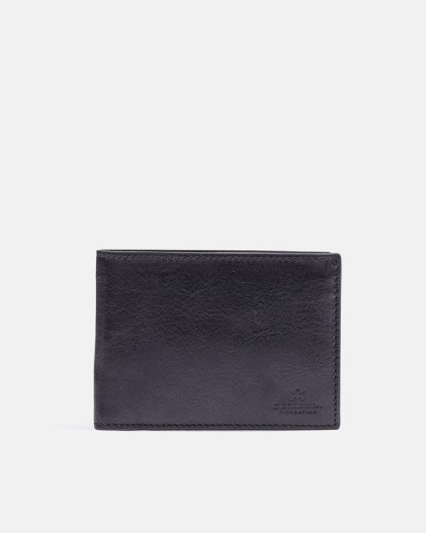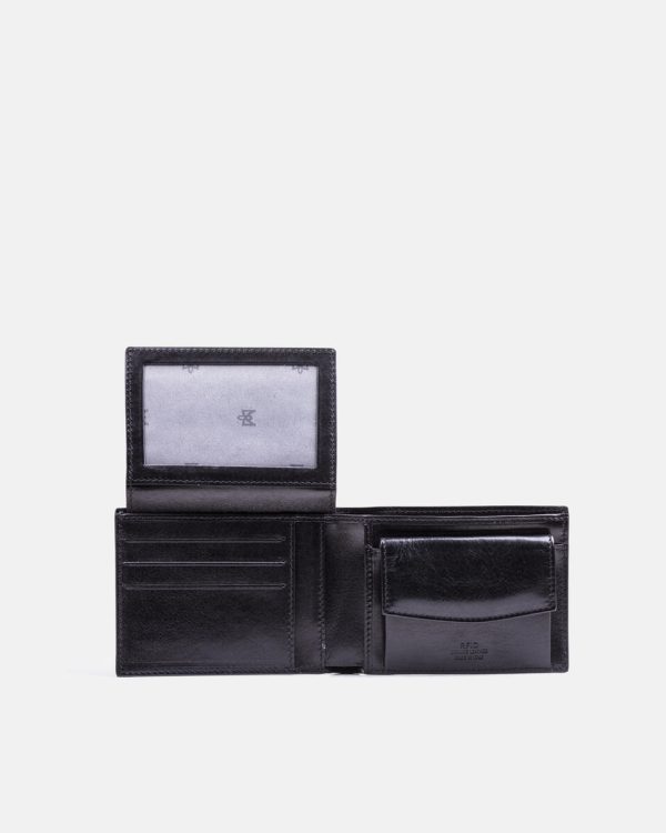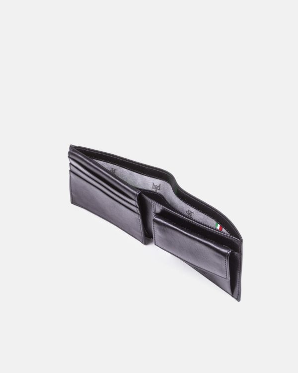 Interior details: 8 card slots, double banknote compartment, three pockets and coin holder with button closure.