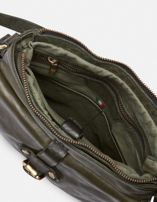 This leather is made with a very complex and difficult treatment. It begins with a skin called CRUST. Each bag is first completely assembled, followed by a dye bath during which it loses 30% of its volume. The bags are then laid out and dried slowly in the open air, then treated one by one by hand with a natural beeswax. This last step gives the product an unmistakable softness and a beautiful aged effect. This type of processing is 100% environmentally friendly and metal free.
