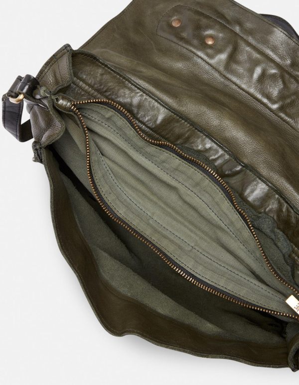 This leather is made with a very complex and difficult treatment. It begins with a skin called CRUST. Each bag is first completely assembled, followed by a dye bath during which it loses 30% of its volume. The bags are then laid out and dried slowly in the open air, then treated one by one by hand with a natural beeswax. This last step gives the product an unmistakable softness and a beautiful aged effect. This type of processing is 100% environmentally friendly and metal free.