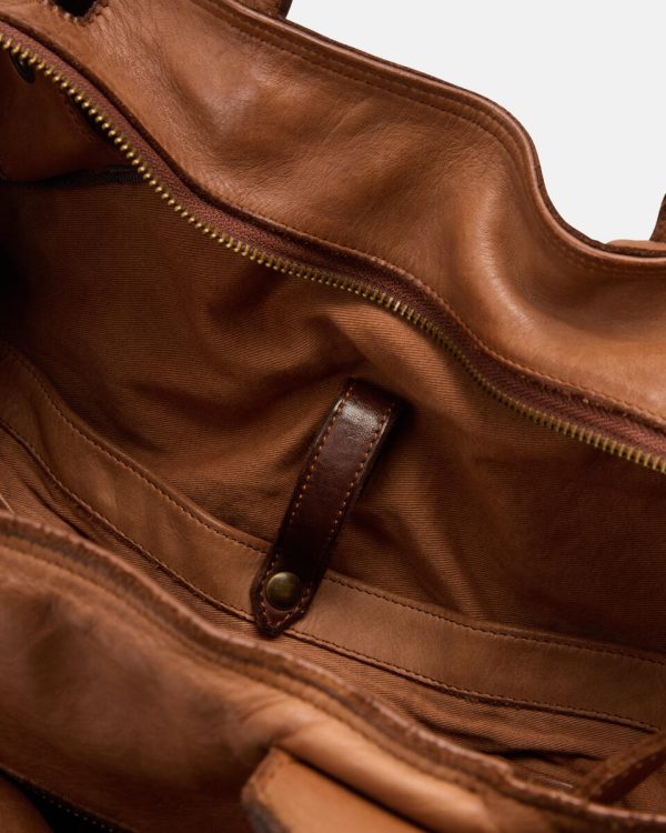 This leather is made with a very complex and difficult treatment. It begins with a skin called CRUST. Each bag is first completely assembled, followed by a dye bath during which it loses 30% of its volume. The bags are then laid out and dried slowly in the open air, then treated one by one by hand with a natural beeswax. This last step gives the product an unmistakable softness and a beautiful aged effect. This type of processing is 100% environmentally friendly and metal free.
