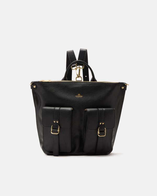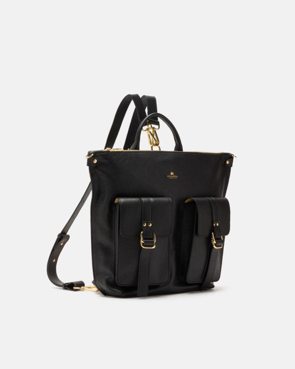 External details: front pockets with adjustable buckles and gold-coloured fire-printed logo, back pocket with magnetic button closure.