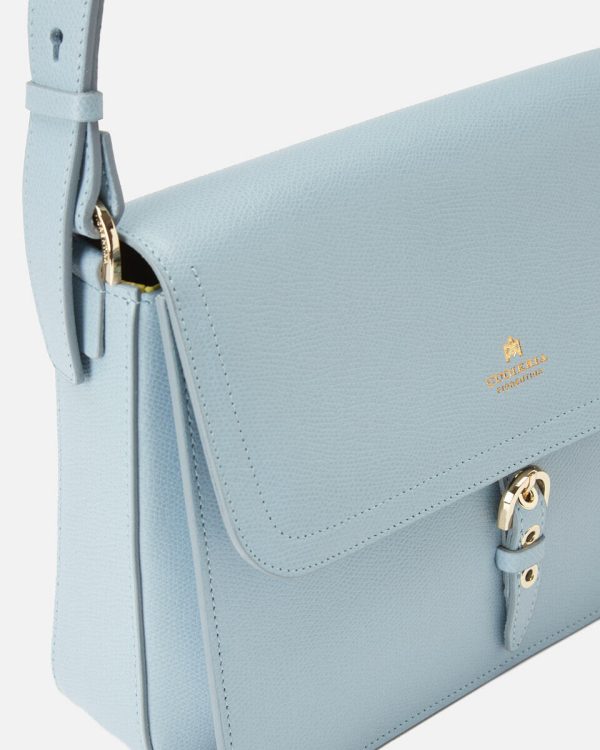 External details: flap closure and magnetic button with gold embossed logo.