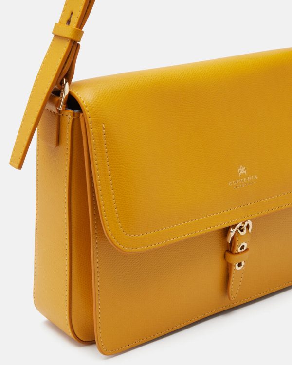 External details: flap closure and magnetic button with gold embossed logo.