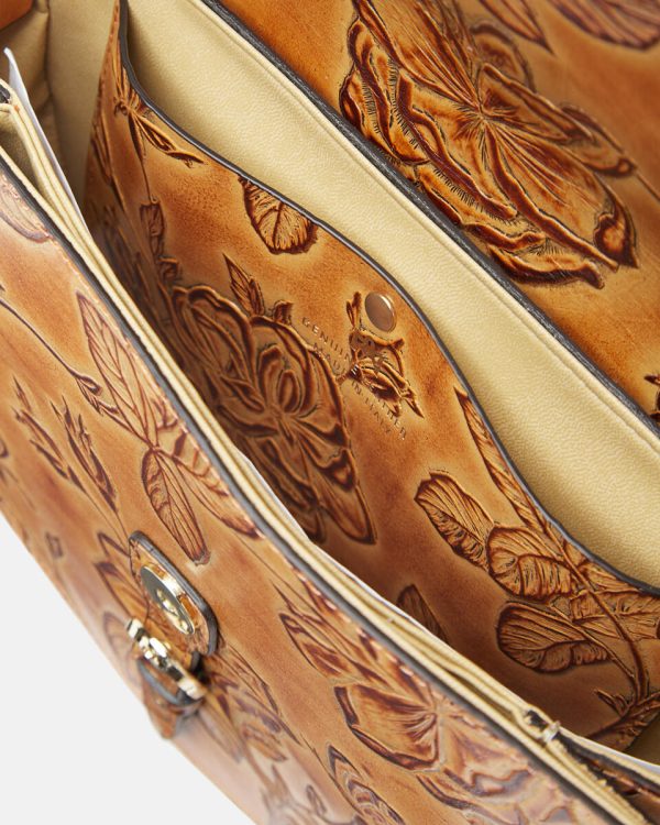 Mimi represents a true style icon and represents a worldwide exclusive of the brand. The peculiarity is contained in the long articulated process consisting of over 13 processing steps of the floral motif. Not only calfskin, but a true artwork, expertly hand-painted on different levels. The end result is a unique material of its kind, with which small masterpieces are made.