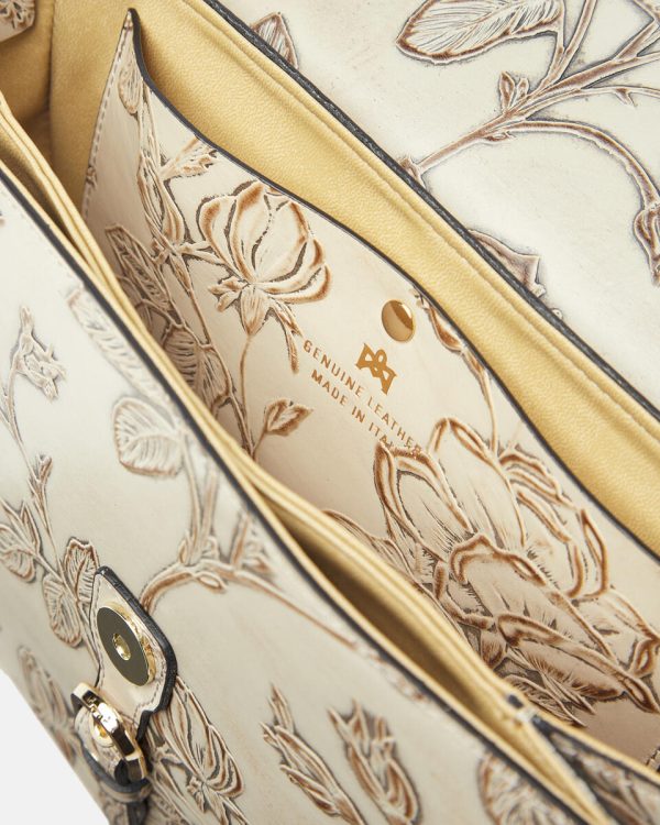 Mimi represents a true style icon and represents a worldwide exclusive of the brand. The peculiarity is contained in the long articulated process consisting of over 13 processing steps of the floral motif. Not only calfskin, but a true artwork, expertly hand-painted on different levels. The end result is a unique material of its kind, with which small masterpieces are made.