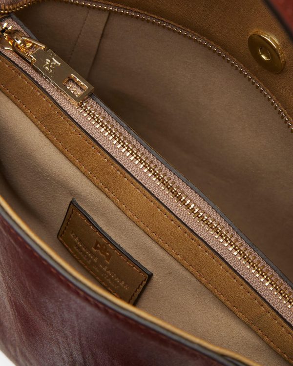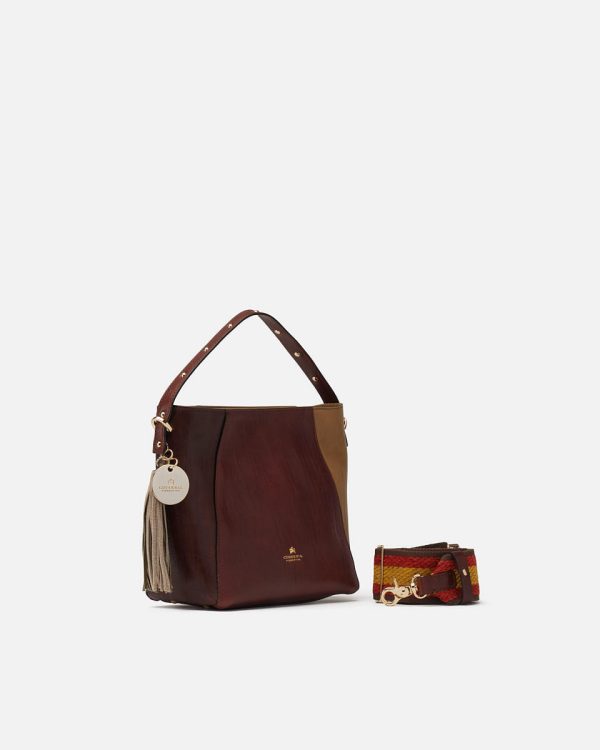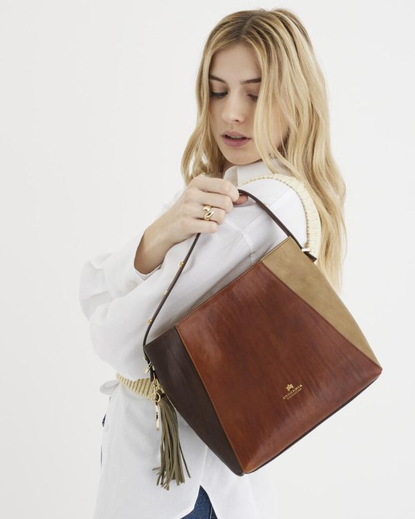 This small tote is filled with tone-on-tone colors and stylish details. The vegetable-tanned Musa Bag makes your outfit exclusive and unique. Details with personality, like golden studs along the handle, a leather tassel, and the unexpected colors of streaked and shaded leather, capture attention and make this bag a bold accessory. The small-but-roomy space inside makes it ideal for transitioning from the office to a drink downtown after work. Make your mark and get noticed on any occasion.
