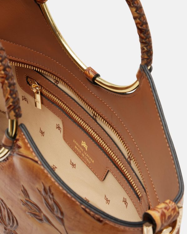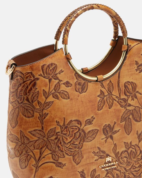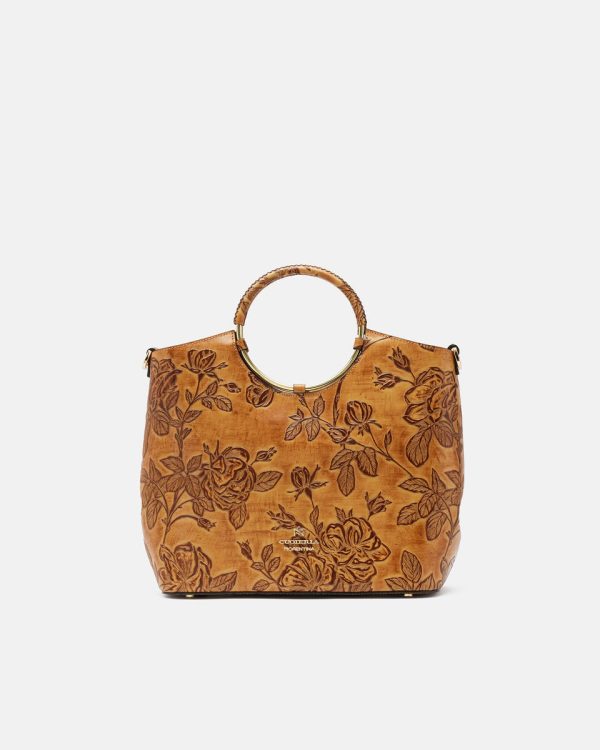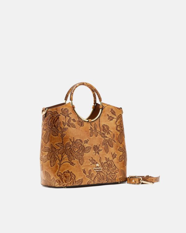 Mimi represents a true style icon and represents a worldwide exclusive of the brand. The peculiarity is contained in the long articulated process consisting of over 13 processing steps of the floral motif. Not only calfskin, but a true artwork, expertly hand-painted on different levels. The end result is a unique material of its kind, with which small masterpieces are made.
