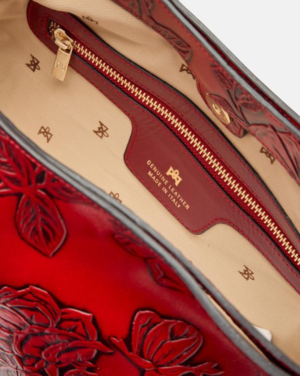 Mimi represents a true style icon and represents a worldwide exclusive of the brand. The peculiarity is contained in the long articulated process consisting of over 13 processing steps of the floral motif. Not only calfskin, but a true artwork, expertly hand-painted on different levels. The end result is a unique material of its kind, with which small masterpieces are made.