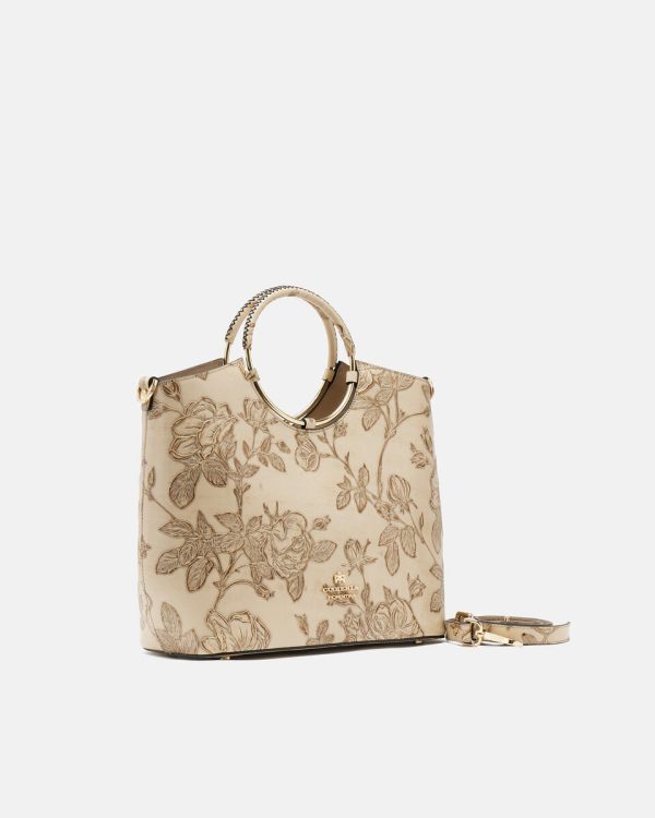 Mimi represents a true style icon and represents a worldwide exclusive of the brand. The peculiarity is contained in the long articulated process consisting of over 13 processing steps of the floral motif. Not only calfskin, but a true artwork, expertly hand-painted on different levels. The end result is a unique material of its kind, with which small masterpieces are made.