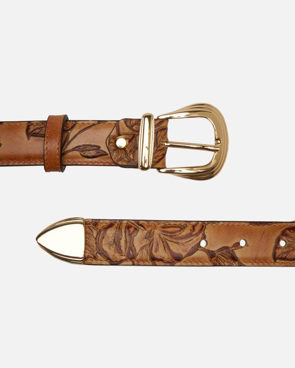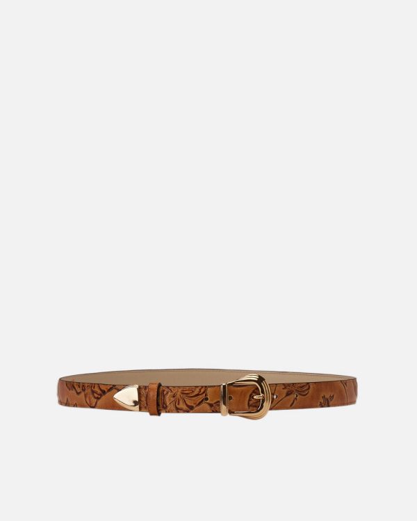Elegant and bohemian, this delightful Mimì belt in fire-printed calfskin captivates with its unique and inimitable floral rose pattern. Perfect to embellish a simple, linear monochrome dress, it is the ideal complement to a romantic Iconic bag from the same collection.