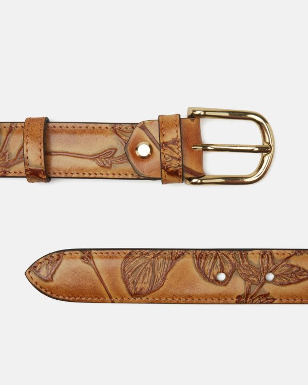 Elegant and bohemian, this delightful Mimì belt in fire-printed calfskin captivates with its unique and inimitable floral rose motif and slender thickness. Perfect to embellish a simple, linear monochrome dress, it is the ideal complement to a romantic Iconic bag from the same collection.