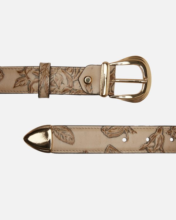 Elegant and bohemian, this delightful Mimì belt in fire-printed calfskin captivates with its unique and inimitable floral rose pattern. Perfect to embellish a simple, linear monochrome dress, it is the ideal complement to a romantic Iconic bag from the same collection.