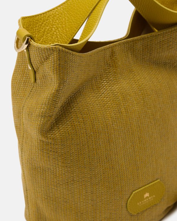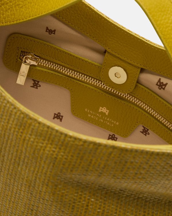 Refined raffia made from a weave of cotton and linen threads and details in soft first-grain calfskin.