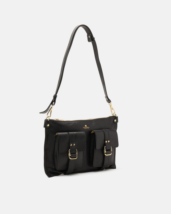 External details:front pockets with adjustable buckles and gold-coloured fire-printed logo, back pocket with magnetic button closure.