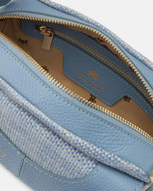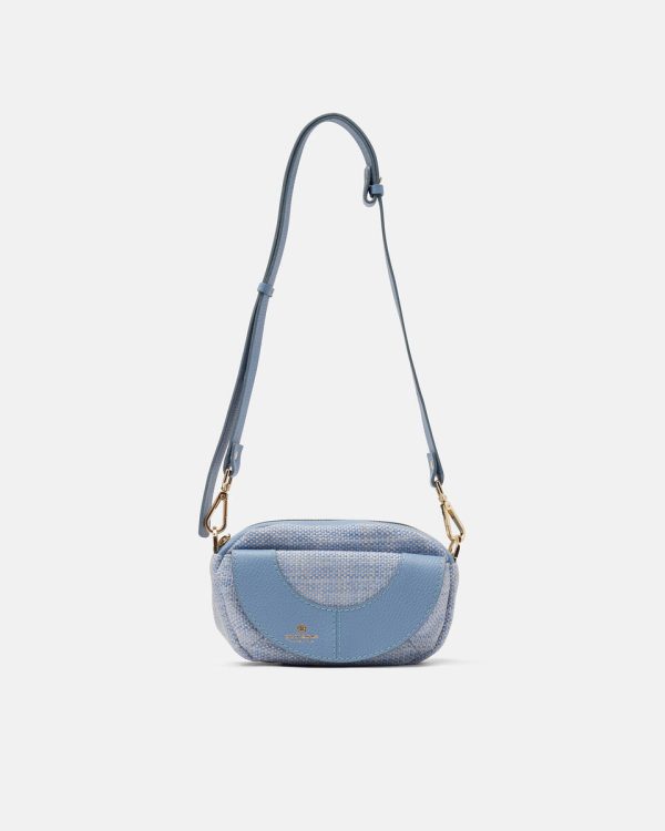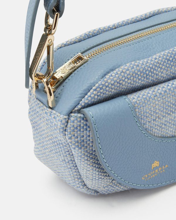Jacquard fabric made from a mix of cotton, linen and raffia, with a consistent and rich weave in neutral colours, for everyday wear. The details are made of full-grain leather.